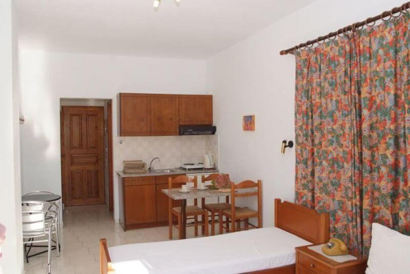Aparthotel CHAROULA Platanias poseduje studije za smeštaj 2 i 3 osobe, i mezonete za smeštaj 4 i 5 osoba. Smeštajne jedinice se svakodnevno čiste, a posteljina i peškiri se menjaju dva puta u toku desetodnevnog boravka. Smeštajni kapaciteti poseduju LCD TV, klima uređaj (bez doplate), peškire, TWC, balkon ili terasu.