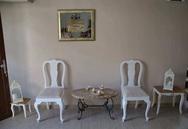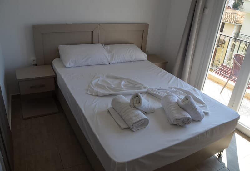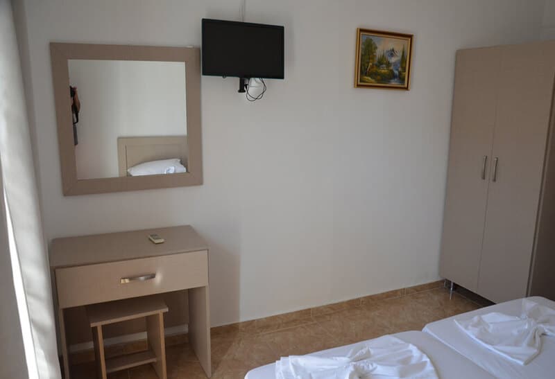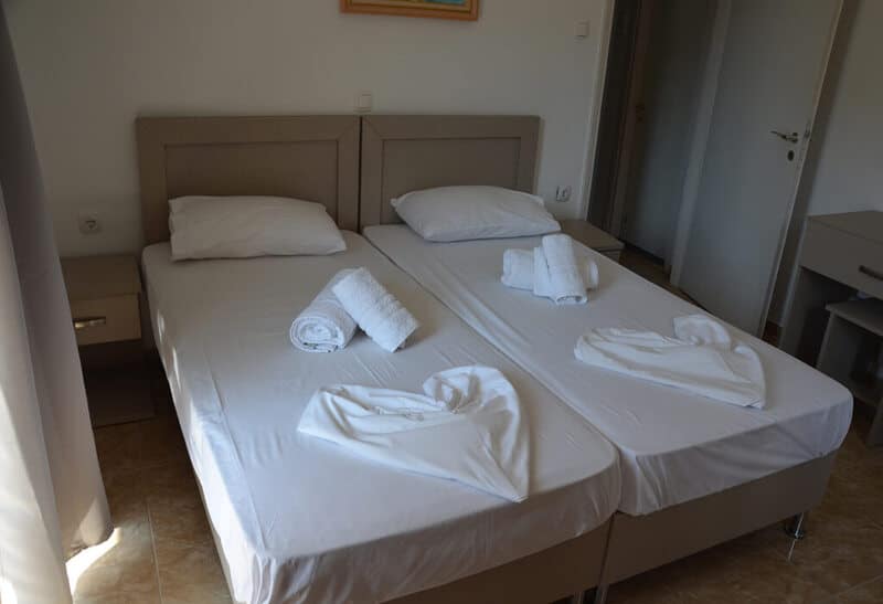 Dvokrevetna soba poseduje francuski ležaj ili dva singl ležaja, dva noćna stočića pored kreveta, ormar, TV, klima uređaj (uz doplatu 7€ po danu), noćni stočić sa ogledalom, manji frižider, TWC, terasu sa stolom i dve stolice.