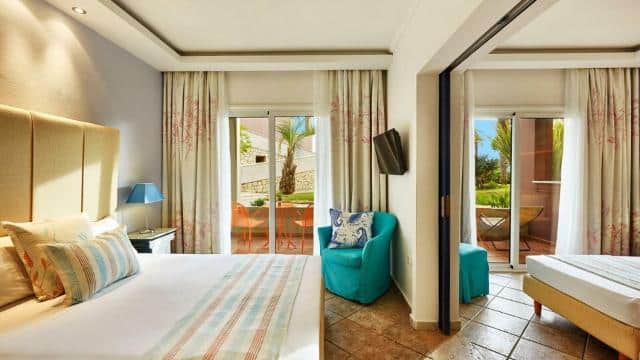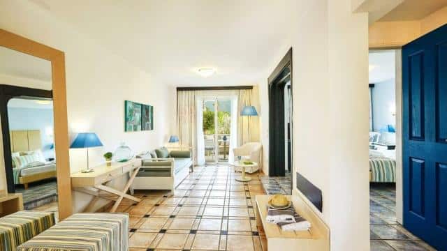 Junior suite (pogled bašta ili more) je površine oko 30m2 i poseduje dnevno- spavaći deo sa francuskim ležajem ili 2 osnovna ležaja i sofu na rasklapanje za odraslu osobu ili 2 dece do 12 godina. Soba je predviđena za smeštaj do 4 osobe.
