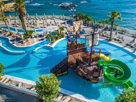U sastavu hotela se nalazi recepcija, 3 restorana, više barova, lift, kompleks bazena sa vodenim toboganima, dečije igralište, teren za tenis i mini fudbal, mini market, spa centar, sala za fitnes, parking…
