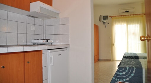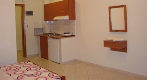 Apartman 1/5 poseduje spavaću sobu u kojoj je francuski ležaj (širine 140cm) i kuhinjski deo sa grčkim ležajem (širine 130cm) i klasičnim ležajem.
