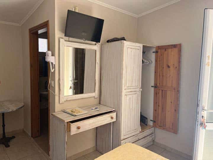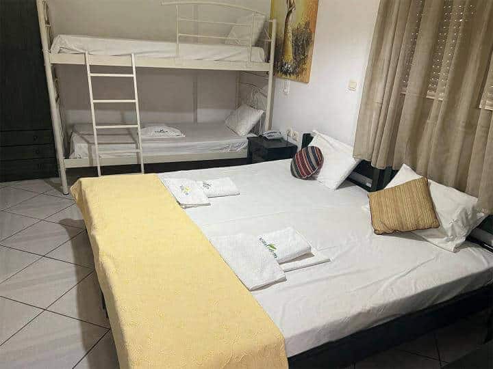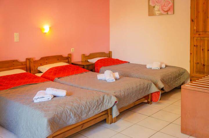 Trokrevetni studio u svom sastavu poseduje francuski ležaj ili dva singl ležaja i jedan singl ležaj ili sofu, ormar, noćni stočić, TV sa lokalnim kanalima, klima uređaj i kuhinjski deo sa rešoom sa dve ringle i frižiderom. Kupatila su ili sa tuš kabinom ili zavesom ili otvorenim prostorom za tuširanje. Svaka soba ima svoju zasebnu terasu sa stolom i tri stolice.