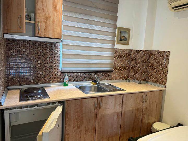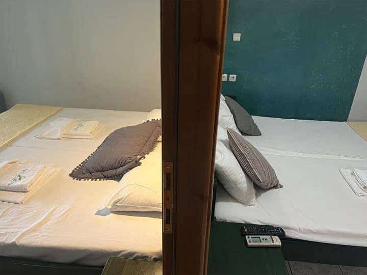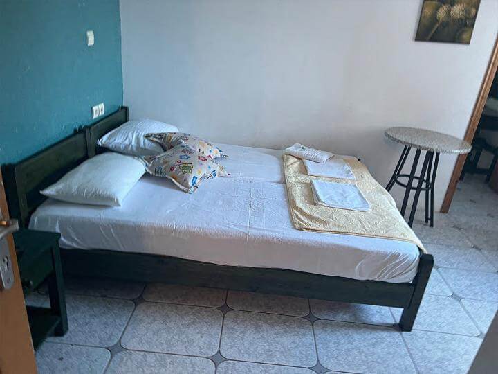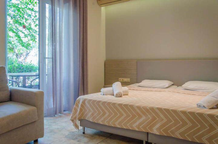 Dvokrevetni studio u svom sastavu poseduje francuski ležaj ili dva singl ležaja, ormar, noćni stočić, TV sa lokalnim kanalima, klima uređaj i kuhinjski deo sa rešoom sa dve ringle i frižiderom. Kupatila su ili sa tuš kabinom ili zavesom ili otvorenim prostorom za tuširanje. Svaka soba ima svoju zasebnu terasu sa stolom i dve stolice.