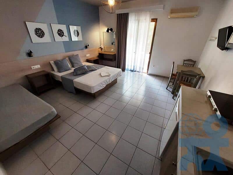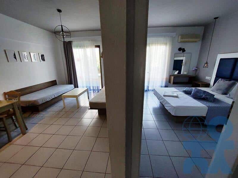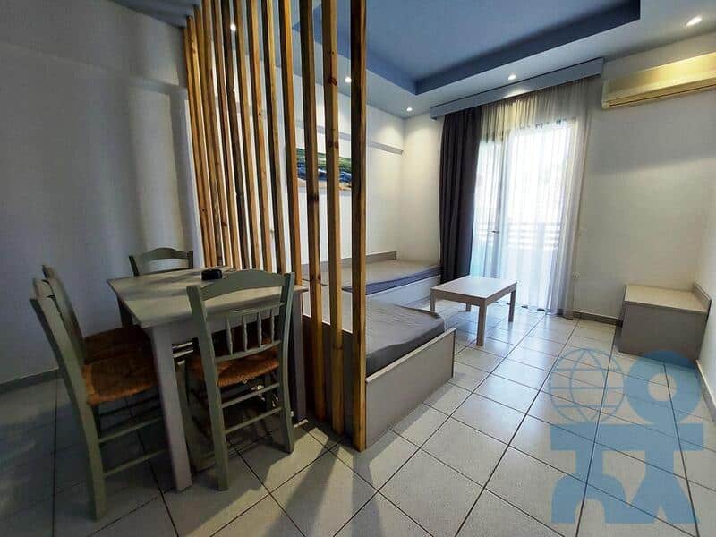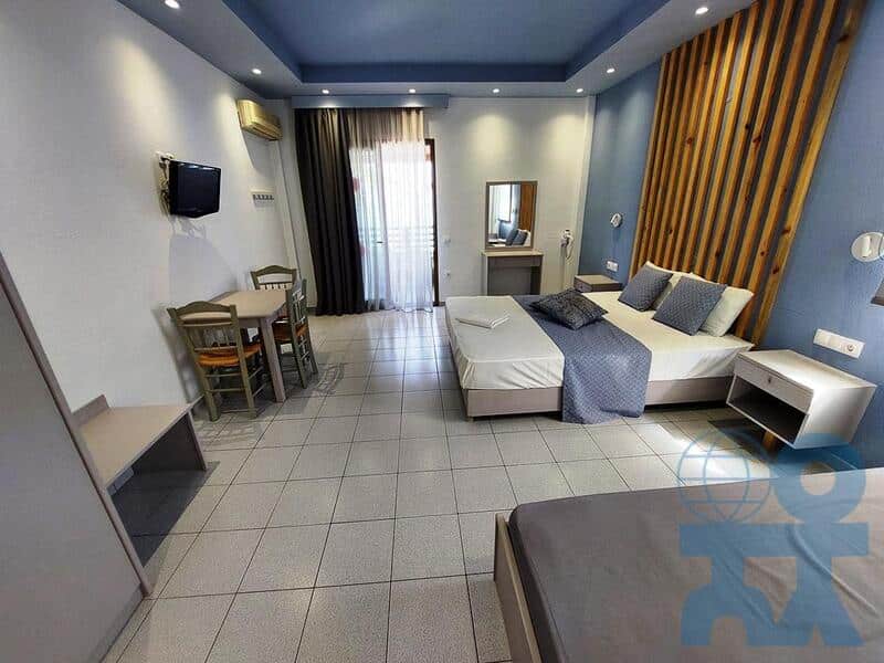 Apartmani poseduju spavaću sobu u kojoj je grčki bračni ležaj i dnevni boravak u kojem se nalaze 2 standardna ležaja i osnovno opremljena kuhinja, TV, klima uređaj, peškire, TWC, terasu sa garniturom za sedenje. Pojedini apartmani imaju bočni pogled more (BPM) ili direktan pogled more (PM).