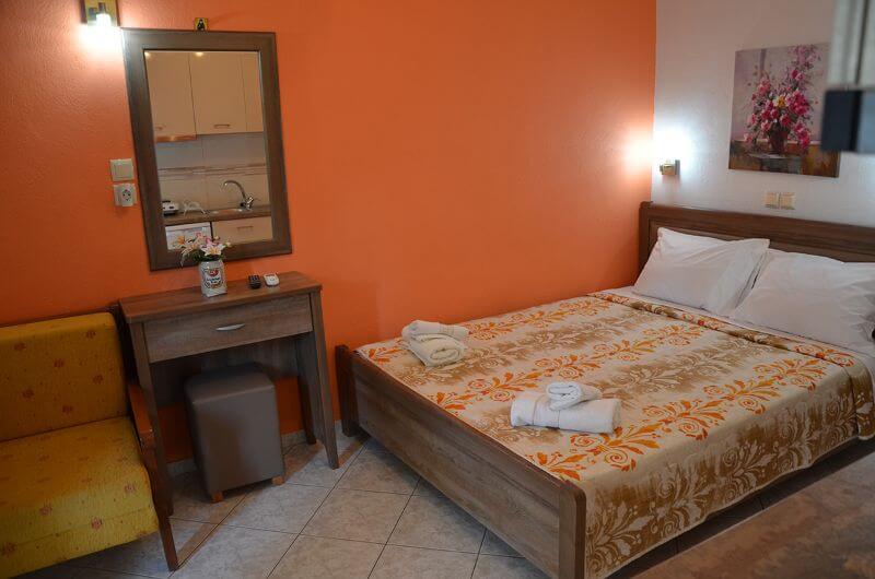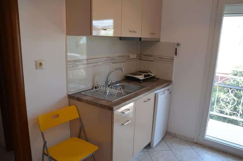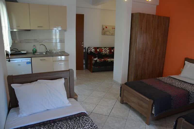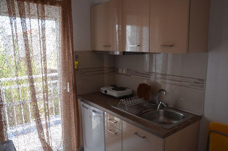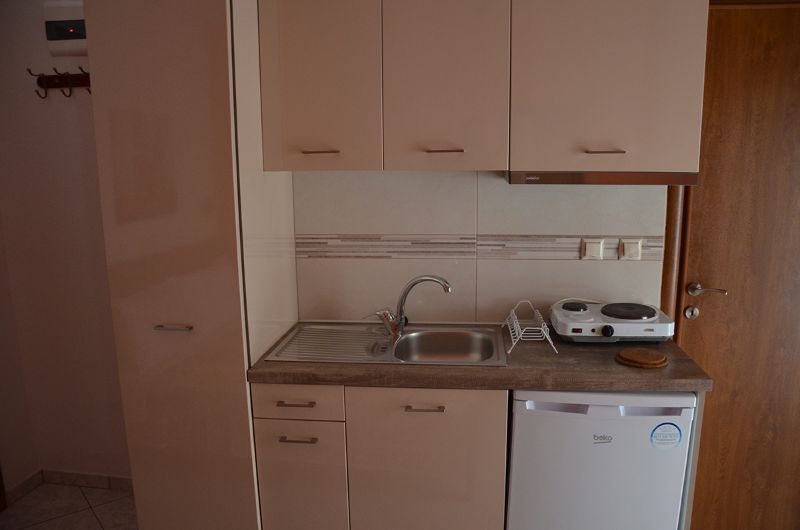 Četvorokrevetni studio: poseduje francuski ležaj i jedan standardni ležaj, dok se kauč nalazi u izdvojenom delu studija (bez vrata). U sklopu studija se nalazi i kuhinja sa rešoom, frižiderom; TV, klima uređaj, kupatilo sa tušem, terasa sa garniturom za sedenje.