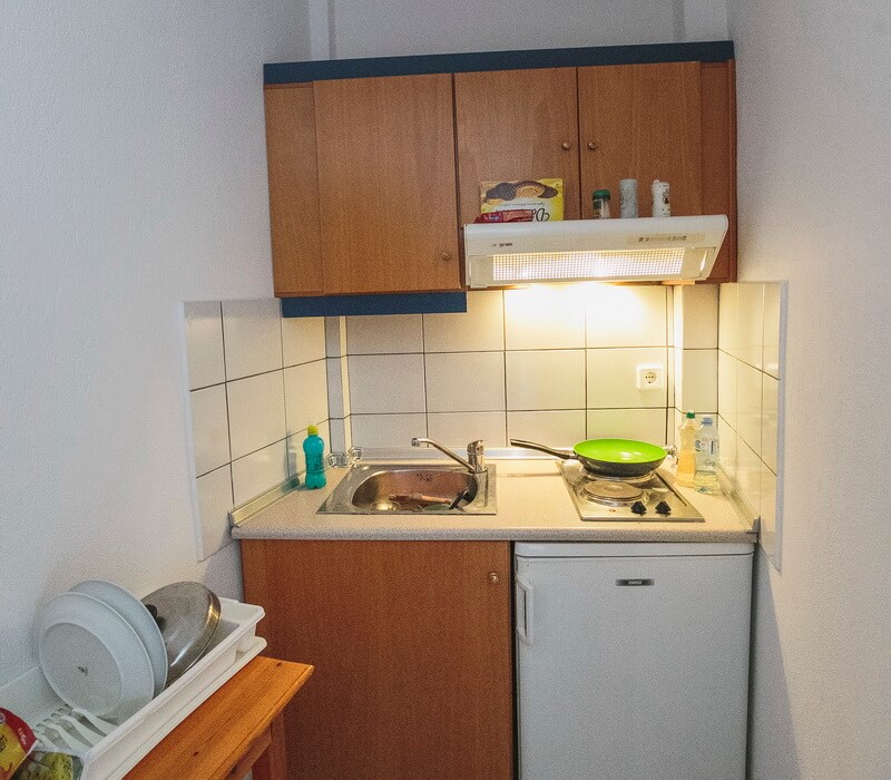 Studio 02: smešteni su na drugom spratu: soba sa dva standardna ležaja, kuhinjski deo (frižider, rešo sa dve ringle, aspirator, električni bokal, posuđe za odgovarajući broj osoba), TV, sef, kupatilo sa peškirima i terasa.