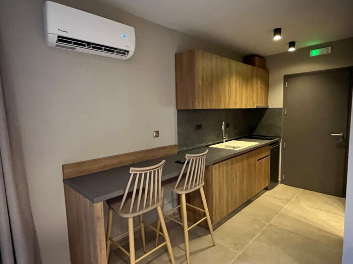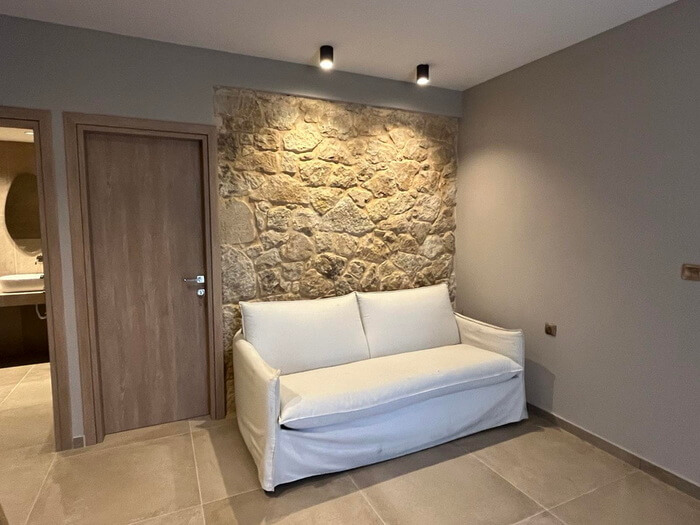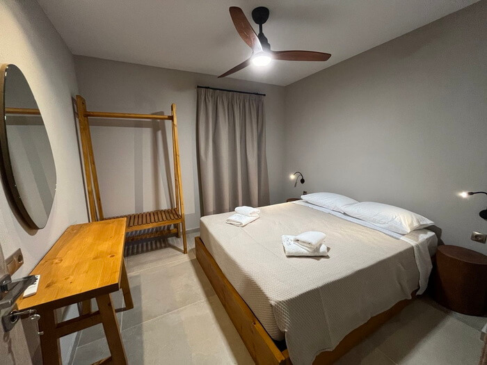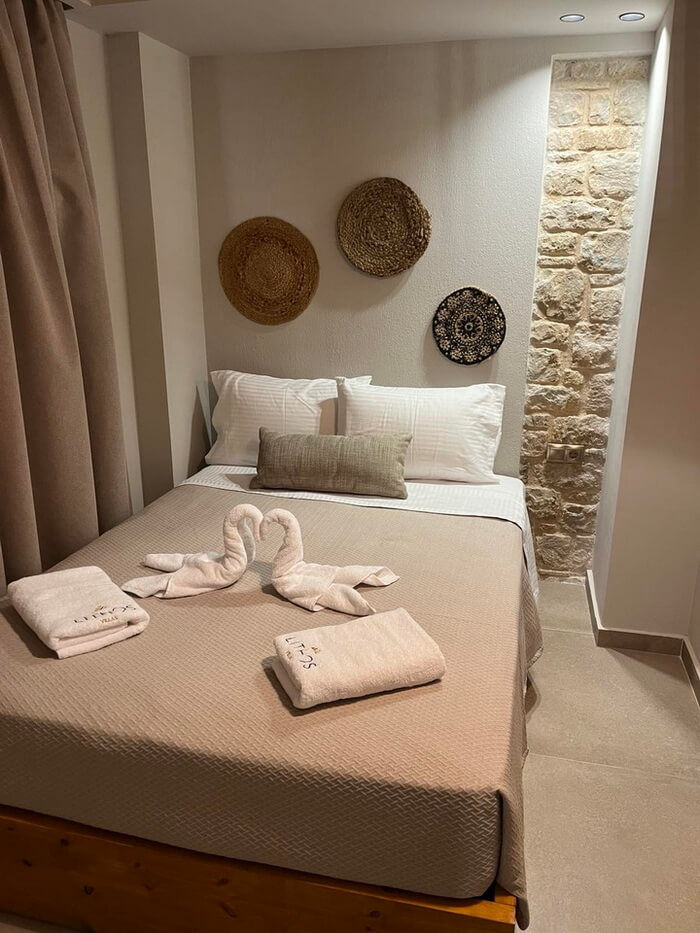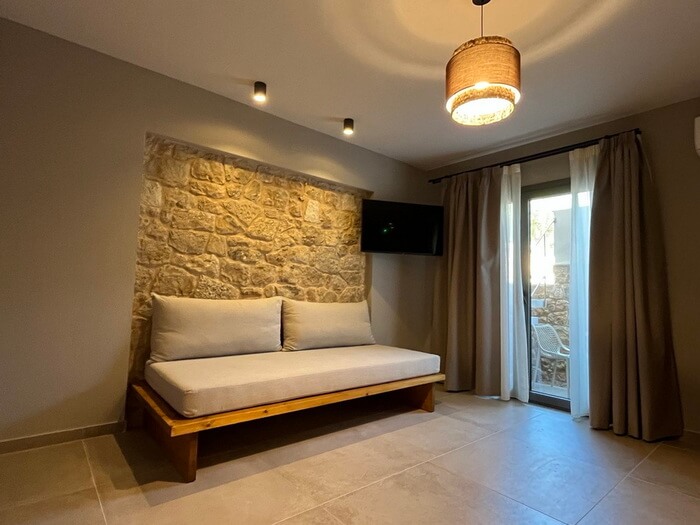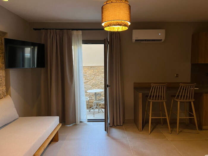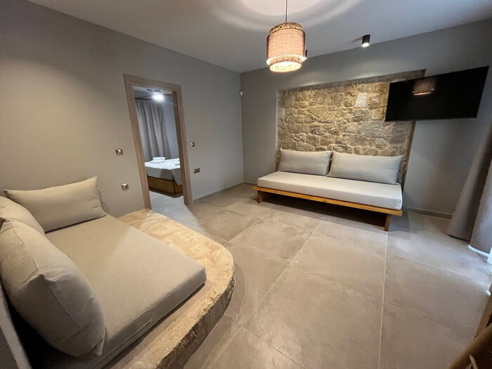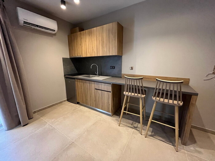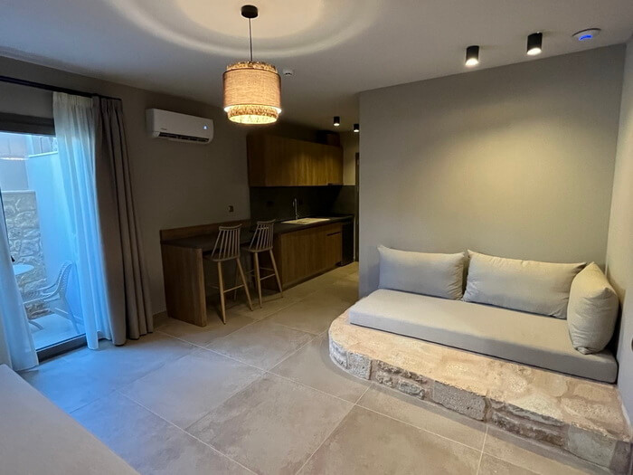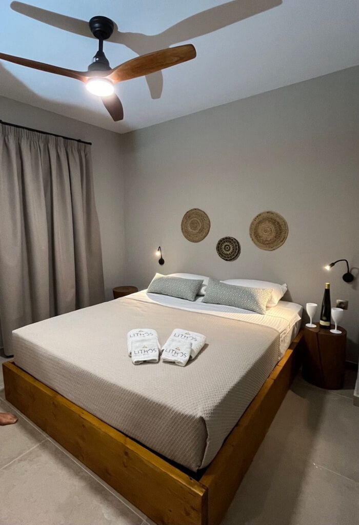 Vila LITHOS VILLAGE poseduje studije i apartmane za smeštaj 2, 3 i 4 osobe. Studiji i apartmani u niskom prizemlju su u glavnoj zgradi, a oni u prizemlju su u manjem depadansu u neposrednoj blizini bazena.