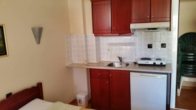 Svaka smeštajna jedinica poseduje kuhinjski blok, televizor, klima uređaj, kupatilo, terasu. Pojedini studiji imaju ugradnu kuhinju na terasi. Ležajevi su standardni francuski, singl ležajevi. Korišćenje klime je bez doplate.