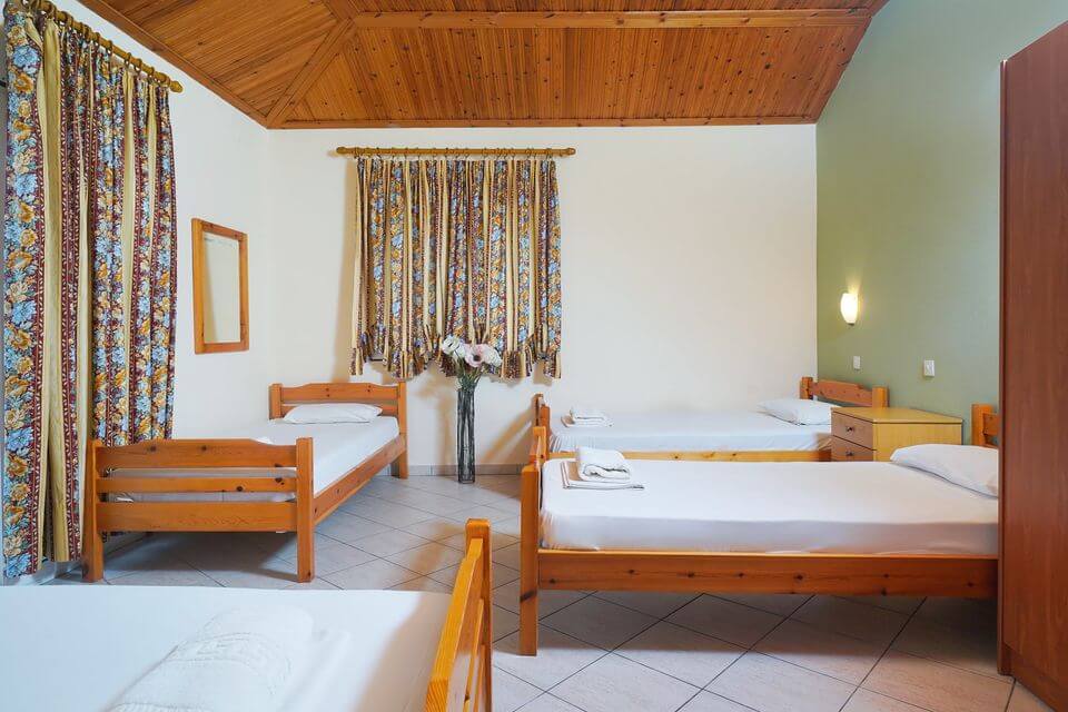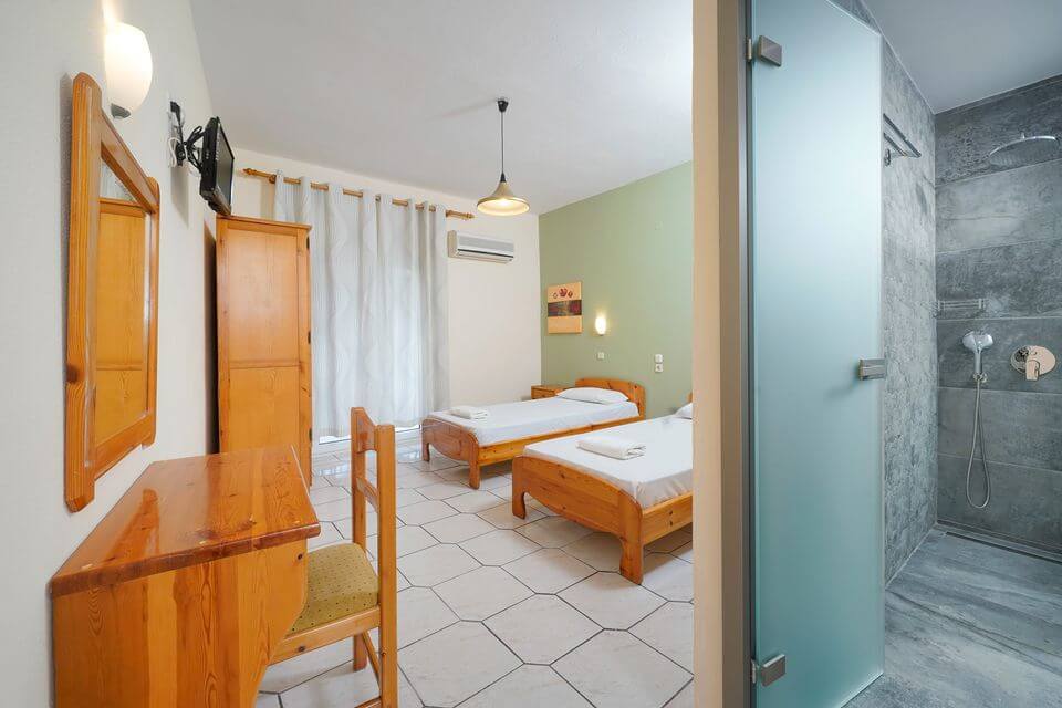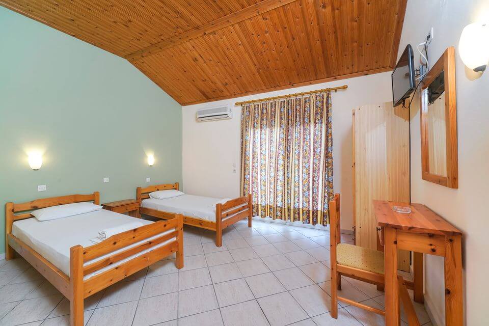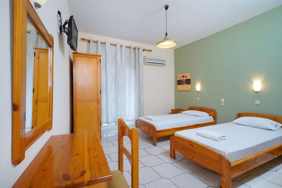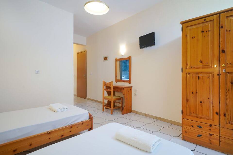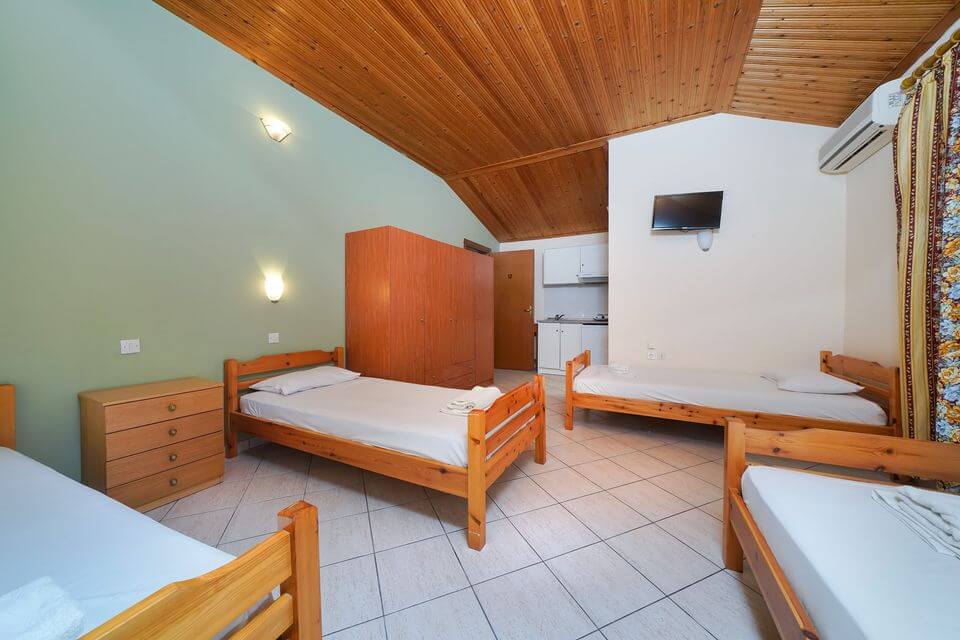 Svaka smeštajna jedinica poseduje kuhinjski blok, televizor, klimu, kupatilo, terasu. U smeštaju su klasični singl i francuski ležajevi.
